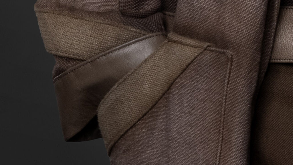 • Cuff Style: Straight cuffs featuring fabric straps with leather trim detailing wrapping around the wrist